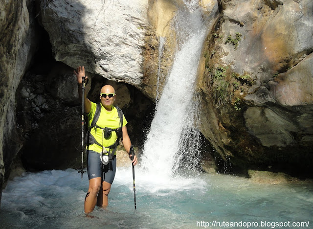 Al principio el cauce del río está disperso debido a que lleva poca agua, pero poco a poco el cauce se va estrechando y el nivel del agua toma altura y rapidez pero sin exageración, aunque es finales de octubre como todavía no ha llovido se puede realizar la ruta sin problemas. Al poco de empezar la ruta llegamos a una cascada a nuestra derecha, mas tarde la volveremos a pasar pero mucho mas arriba por la acequia por donde volveremos. Continuamos por el río pasando la zona mas estrecha y me atrevería a decir mas espectacular, aunque cuando llegamos al la zona denominada de las pozas también es espectacular ya no por lo estrecho de cauce sino por las rocas que tiene que sortear el río y los saltos que produce.