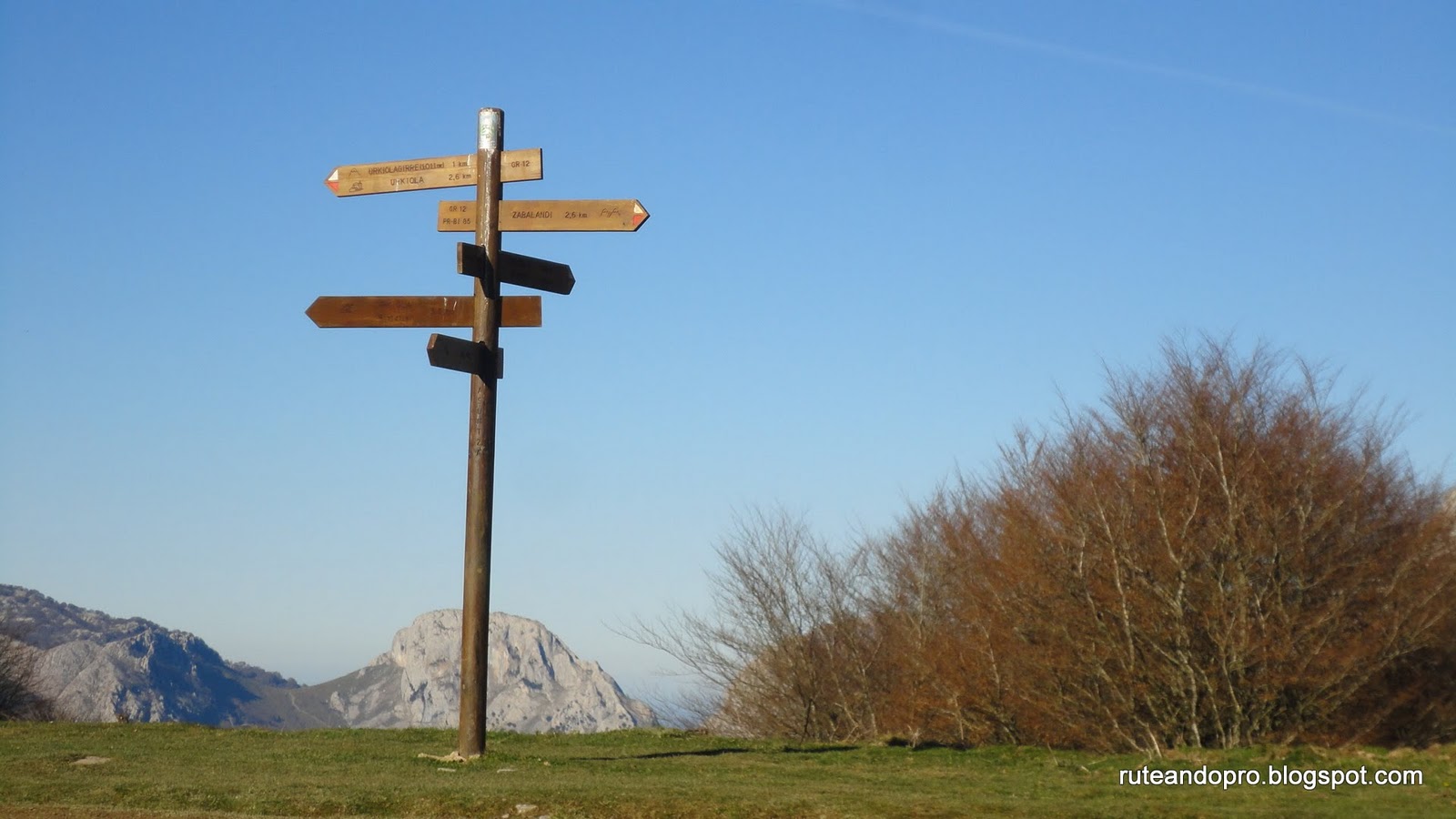 Si iríamos hacia la dch.(SSE) nos dirigiríamos hacia el col. de Zabalandi (ruta azul), coincidente durante unos metros con la bajada del barrio de Olaeta (580 mts).