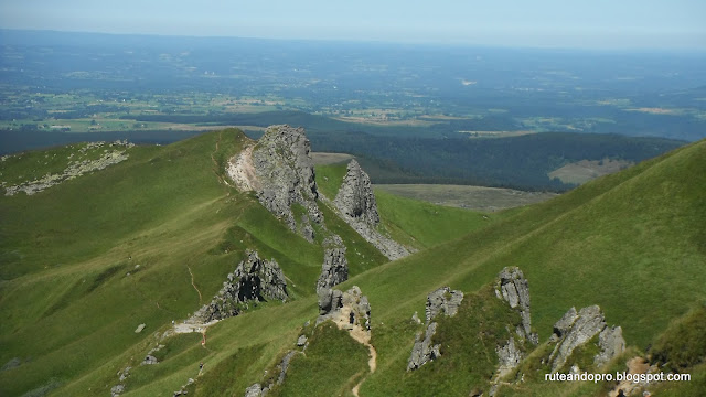 La ruta la hemos comenzado en el parking de la estación de esquí de Monte-Dore, la subida se puede realizan en el sentido de la marcha que nosotros hemos elegido o bien en sentido contrario es decir subiendo por donde nosotros bajamos. Una vez hemos aparcada comenzamos la ruta por un sendero que parte al final del parking a la izquierda, justo al comienzo hay un cartel informativo, por cierto por donde hemos comenzado está prohibido el paso de perros de compañía incluso atados. después mas arriba si nos pueden acompañar pero atados. El camino atraviesa un pequeño valle muy verde y de pendiente suave al principio y nos deja entrever los magníficos paisajes que nos esperan.