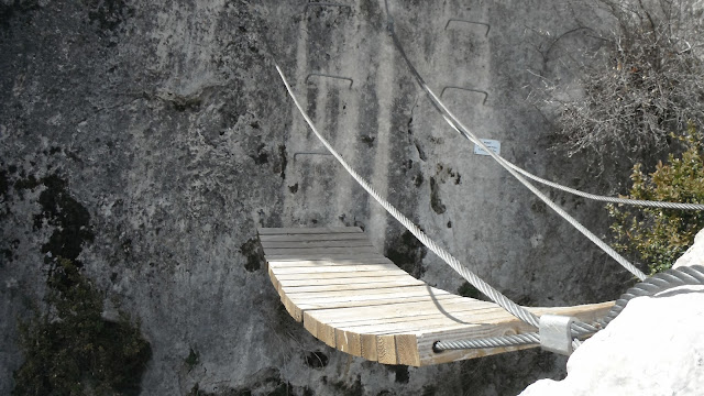 A partir de aquí prácticamente no queda nada hasta el final. Cuando llegamos a lo que parece el final de la ferrata, tenemos dos opciones: una es bajar por un camino bastante empinado y equipado con cuerdas que nos ayudarán a pasar por las zonas mas delicadas y otra continuar por la ampliación de la ferrata que hicieron en el 2012, que nos llevará hasta la aguja de la Garriga, a través de un largo flanqueo lateral y un puente tibetano. Nosotros optamos por bajar directamente ya que en la zona de puente tibetano nos encontramos con mucha gente, incluso había que hacer cola.
