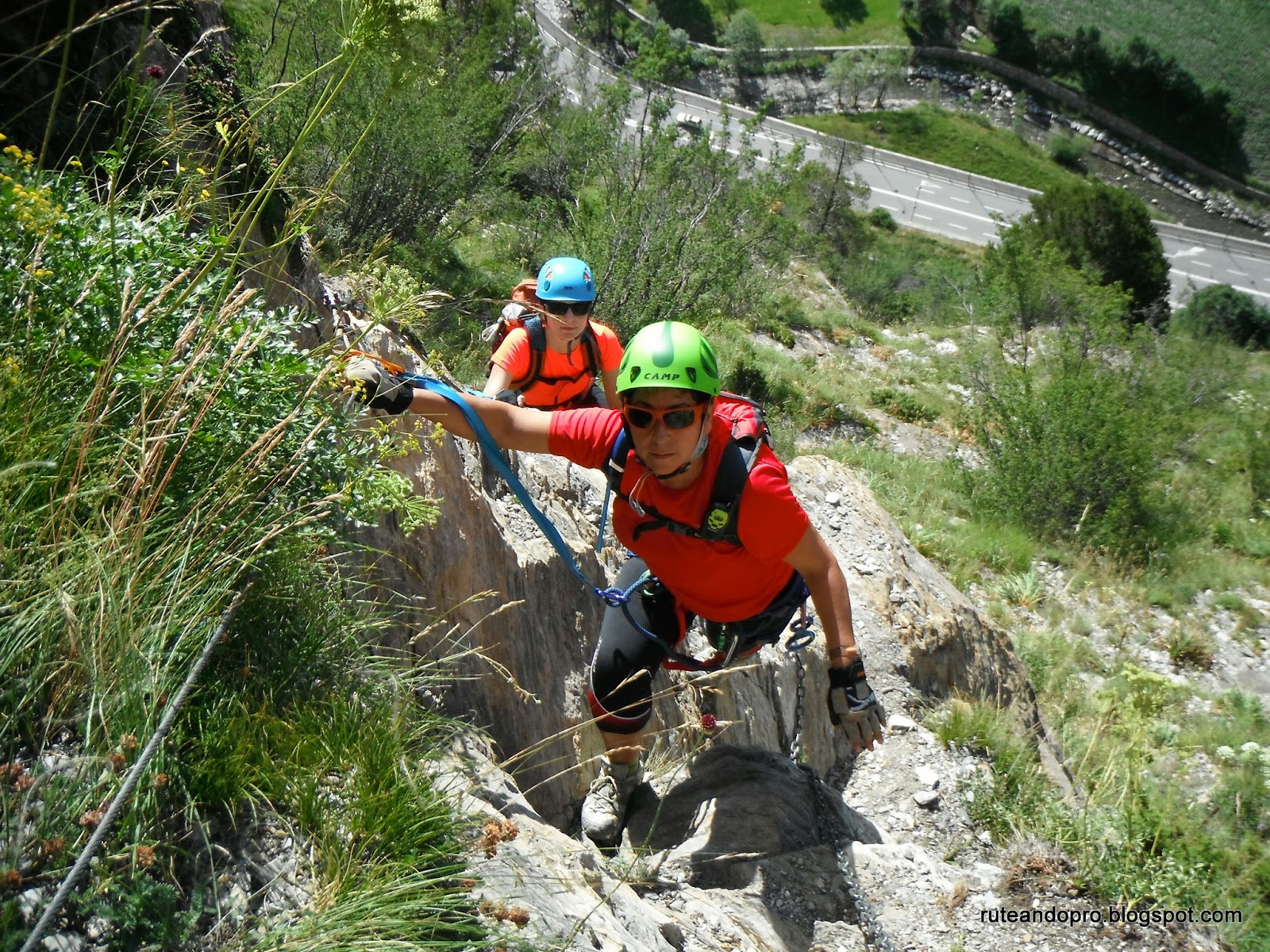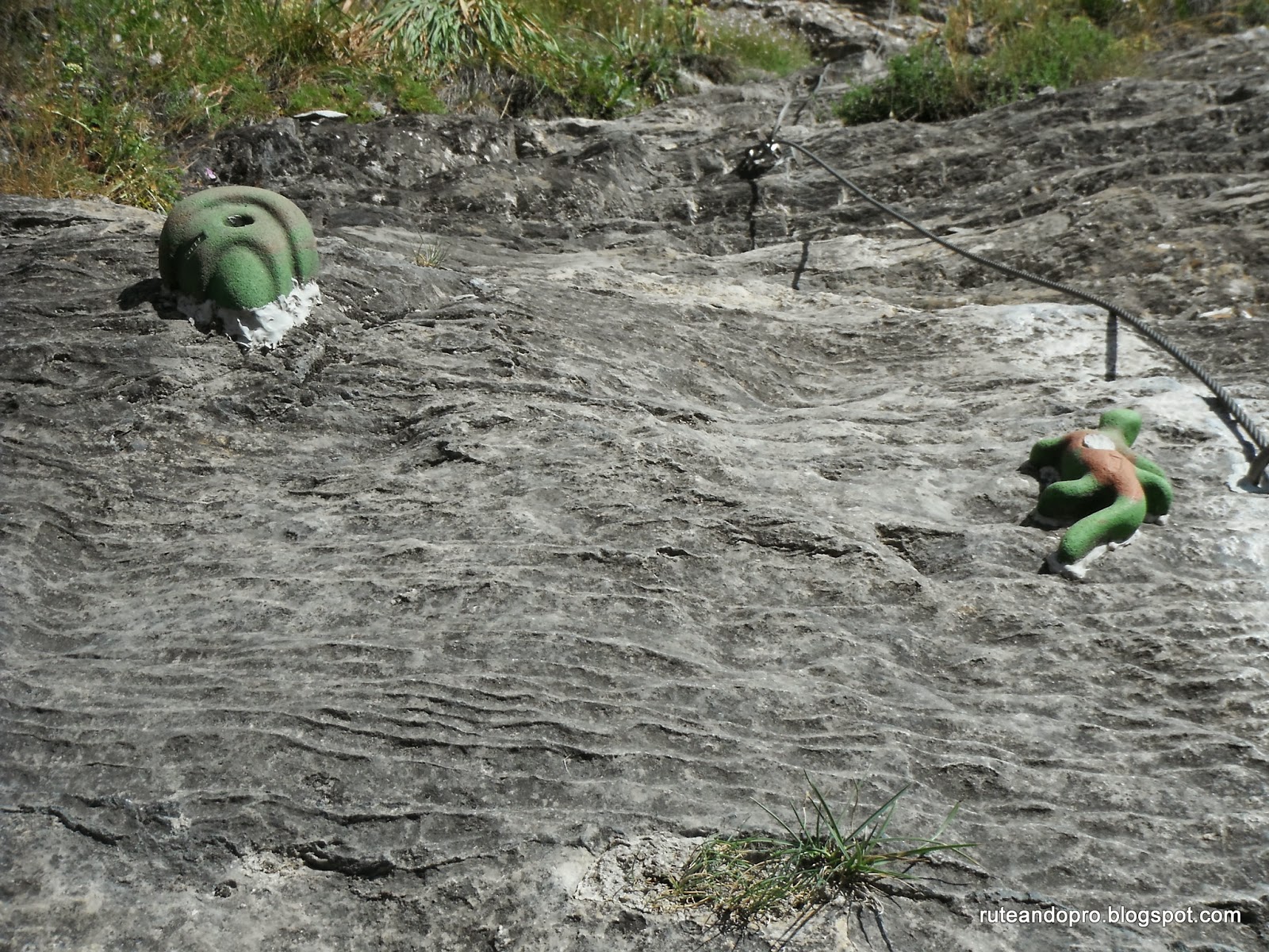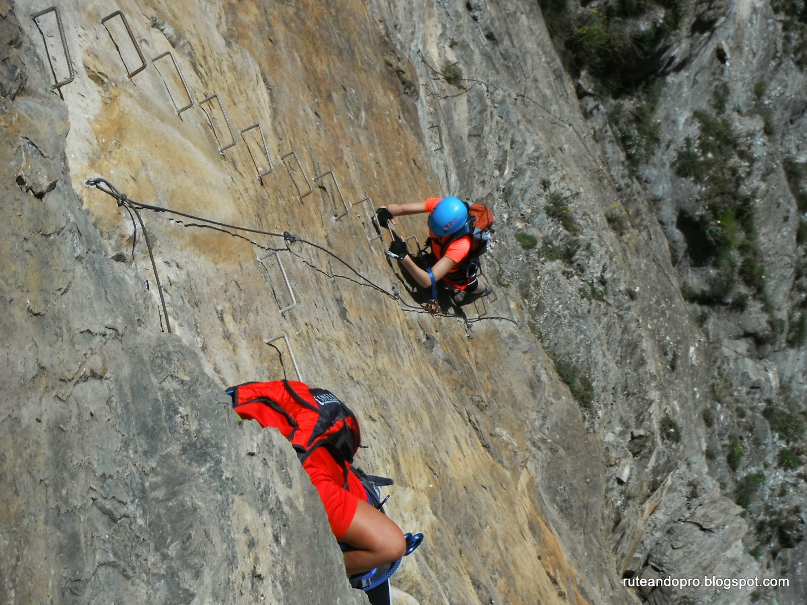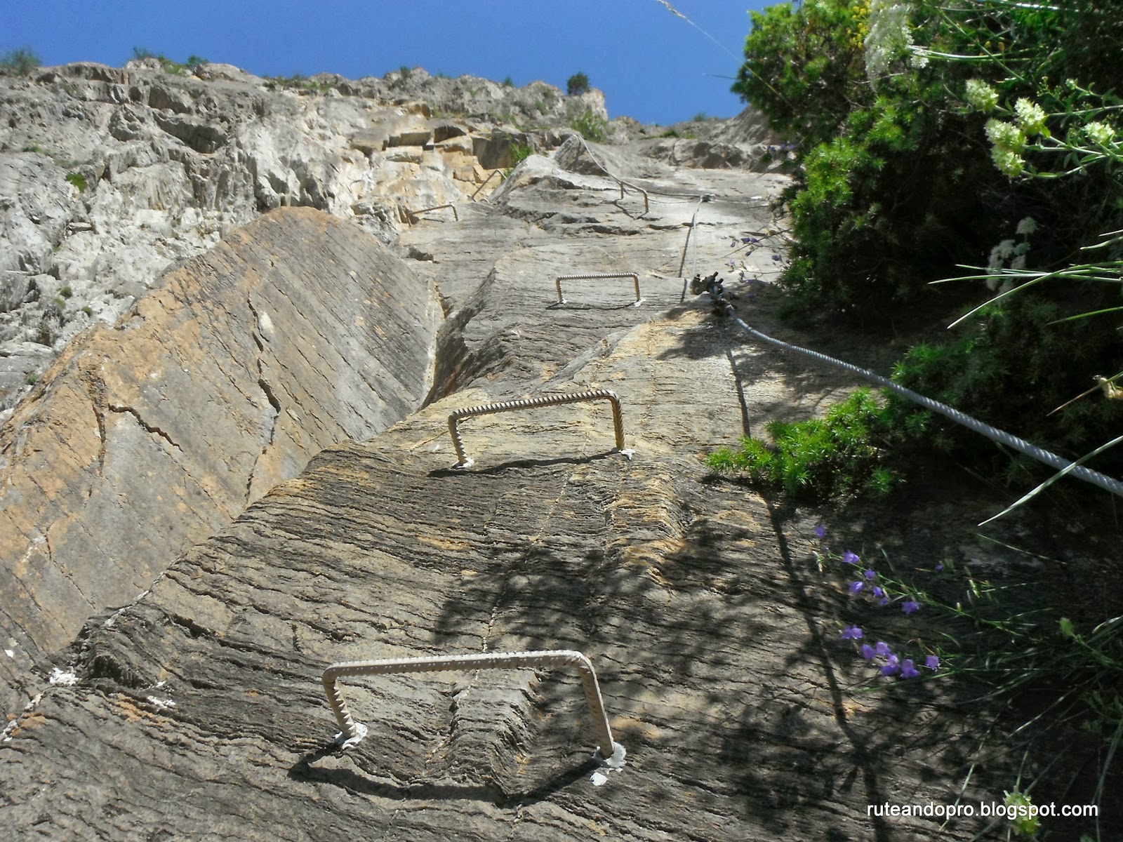El camino nos lleva en forma de zig zag hasta una pared que inicia un segundo tramo. A partir de aquí empieza la dificultad, las grapas están muy espaciadas y ladeadas lo que hace que debas estirarte con los brazos y apoyarte en las piernas utilizando muchas veces la roca natural.